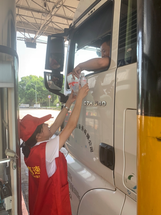 服務在崗,情系災區 ——臨海南收費所組織開展“獻愛心”活動 8月14日中午,臨海南收費所車道安全島內搭起臨時愛心服務臺,準備了禮品袋、礦泉水、風油精、人丹等物品,為過往司乘人員免費提供解暑用品。 高溫天氣中,該所員工身穿耀眼的“紅馬甲”,面帶微笑,顯得格外耀眼動人。