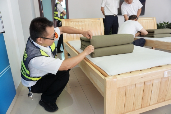 圖為比賽現(xiàn)場 活動(dòng)現(xiàn)場,裁判宣布比賽規(guī)則及打分標(biāo)準(zhǔn):評分從被子整體形狀、平整度、棱角明顯、折疊時(shí)間等方面判斷,規(guī)定在5分鐘內(nèi)完成,共設(shè)置一、二、三等獎(jiǎng)三個(gè)獎(jiǎng)項(xiàng)。內(nèi)務(wù)半軍事化在該所已是常態(tài),參賽選手們很快進(jìn)入狀態(tài),從鋪到疊再到整,駕輕就熟,均能在規(guī)定時(shí)間內(nèi)整出“豆腐塊”。評委現(xiàn)場進(jìn)行點(diǎn)評和打分。經(jīng)過競逐,最后副站收費(fèi)四班何翊平奪得一等獎(jiǎng)。比賽分四輪進(jìn)行,且全程用時(shí)不到1個(gè)小時(shí)。