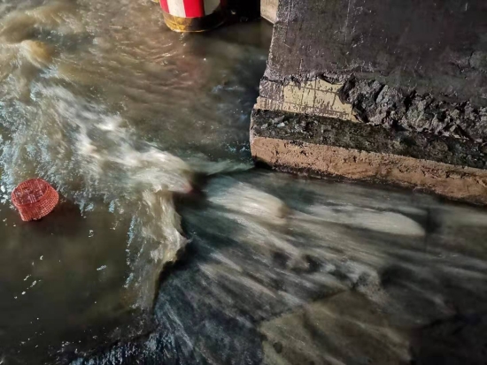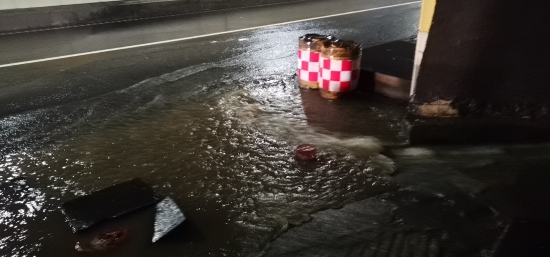 圖為車(chē)道水流 當(dāng)晚19:12分,黃土嶺隧道所中控員徐彤霞發(fā)現(xiàn)寧向隧道主車(chē)道路面出現(xiàn)積水,如不及時(shí)處置,路面濕滑會(huì)讓過(guò)往車(chē)輛打滑,嚴(yán)重影響隧道的安全暢通。為了杜絕安全隱患,管理所立即啟動(dòng)防汛應(yīng)急方案,中控員第一時(shí)間在管理群發(fā)送現(xiàn)場(chǎng)圖片,并在同一時(shí)間通知執(zhí)勤隊(duì)與監(jiān)控中心。 執(zhí)勤隊(duì)員不顧狂風(fēng)暴雨趕赴現(xiàn)場(chǎng),19:19分,斜井現(xiàn)場(chǎng)山上倒灌入隧道的水嘩嘩直流,儲(chǔ)水池水流急促,執(zhí)勤隊(duì)員立即分工合作,一組在主車(chē)道擺放安全錐采取防護(hù)措施,并利用沙包,堵住排水溝壁,使水盡量不往外滲,及時(shí)避免了積水對(duì)隧道內(nèi)行車(chē)造成的安全隱患。一組檢查潛水泵是否正常運(yùn)行,查看積水入侵的原因、排水溝通暢情況。