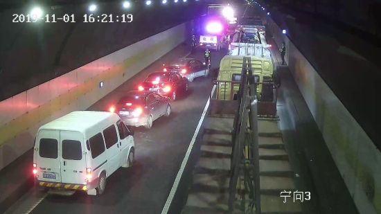 隧道內三車追尾,“指揮員”“救援隊”“搬運工”齊上陣 11月1日14時23分,黃土嶺隧道所中控員王之佳發現寧向隧道進洞300米處超車道發生一起三車追尾交通事故。于是,執勤隊員火速趕赴事故現場。 事故現場,一輛貨車橫跨在超車道上,貨車上的桔子散落一地,現場一片狼藉,事故車輛占用了隧道內僅有的兩個車道,導致后方車輛一度無法通行。所幸的是司機只有輕微受傷。