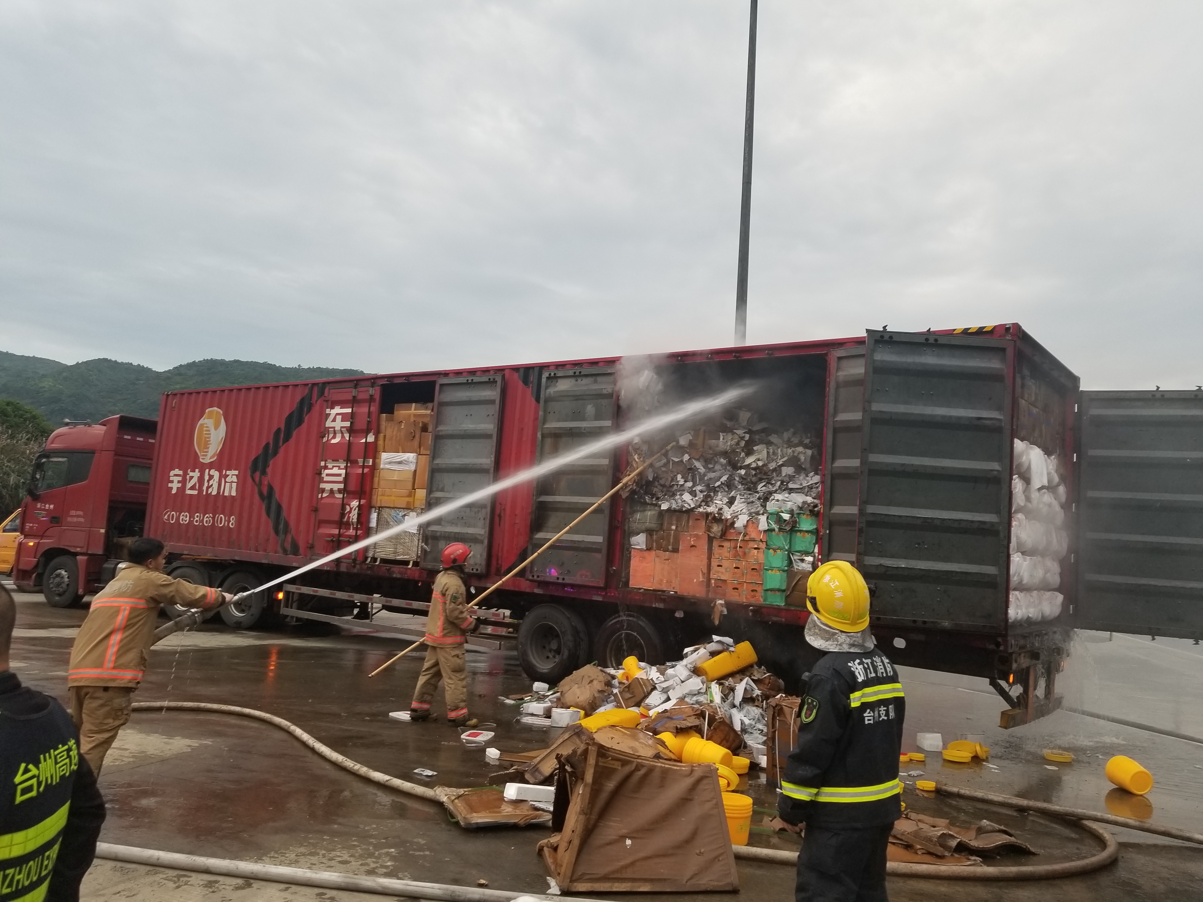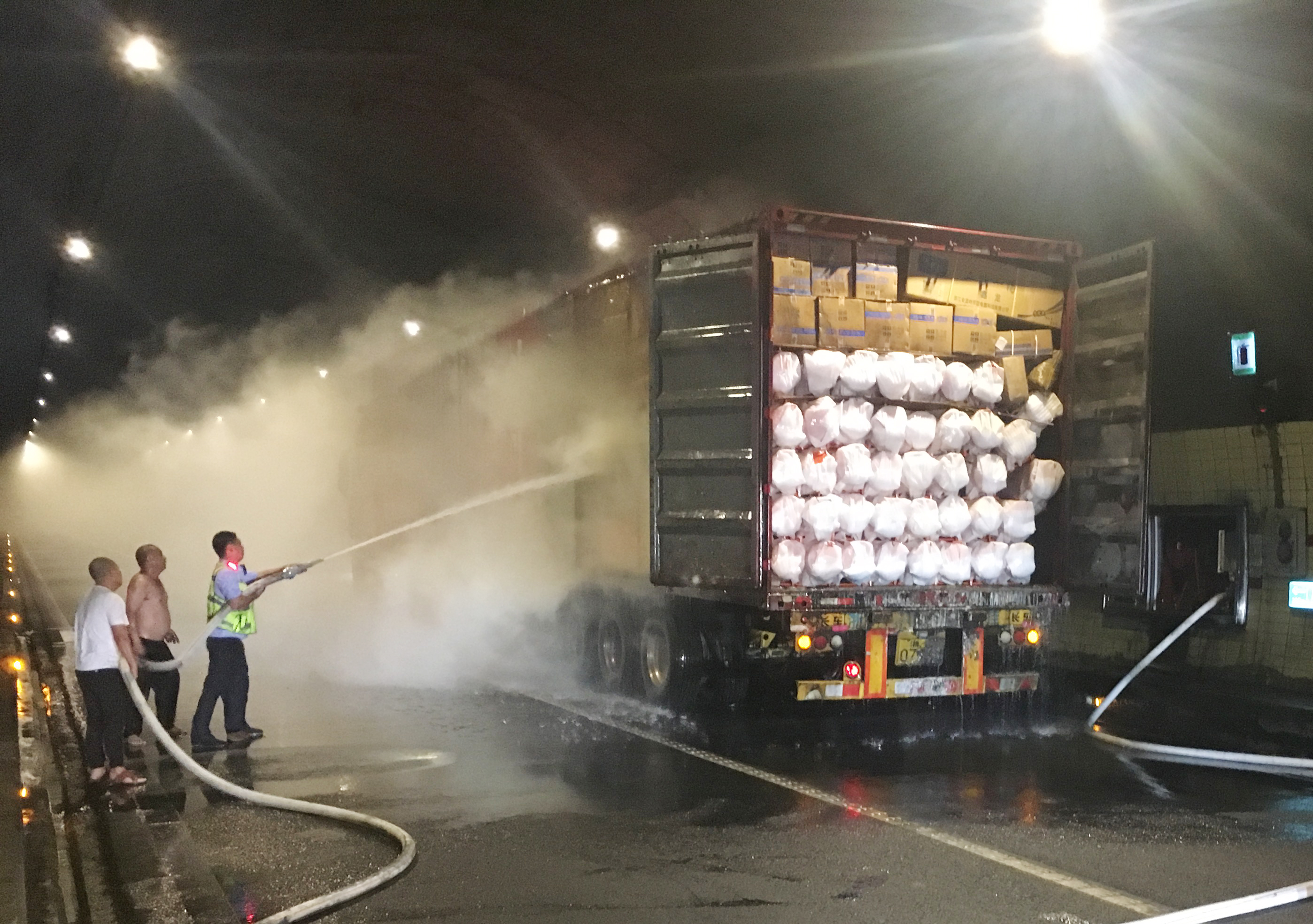圖為滅火現(xiàn)場 萬幸的是,恰逢溫州高速交警巡邏車經(jīng)過,隨即在該貨車后方預(yù)警,很快的所巡邏車、消防車先后到達(dá)現(xiàn)場協(xié)同滅火。由于該車貨物較多,且裝載物皆為紙箱和塑料,集裝箱底層溫度較高,一時只能將明火撲滅,但車廂內(nèi)仍有大量煙霧,為了安全,車子必須盡快撤離隧道,執(zhí)勤隊當(dāng)即決定讓駕駛員把車開往南廣場繼續(xù)滅火,消防車則一路緊隨其后滅火,以防火勢變大。 05:02分,大貨車終于開至南廣場,消防隊員對車上的貨物進(jìn)行清理,才徹底將此次火災(zāi)撲滅,隧道恢復(fù)安全行車。
