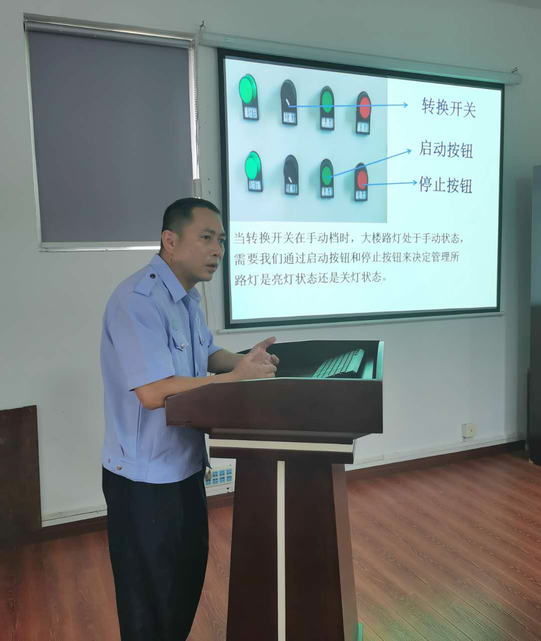 圖為電工業(yè)務(wù)培訓(xùn)現(xiàn)場 湯寧光在電工崗位已經(jīng)19載,有著豐富的工作經(jīng)驗。他用聊家常的方式來講解線路控制的工作原理圖、電路的故障排除方法、光控開關(guān)的接線方法,PPT課件中配有隧道所配電房中相應(yīng)的照片和線路圖,并注解,簡潔明了,通俗易懂。在授課過程中,他每講到一處結(jié)尾,便與聽課人員互動,現(xiàn)場為大家答疑解惑,課堂氛圍熱烈,互動感很強。