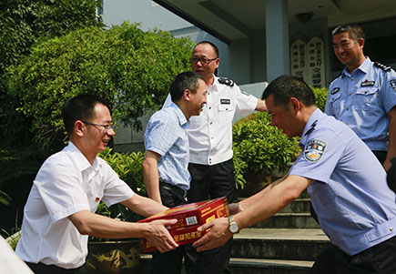 圖為公司副總經(jīng)理董阿林給高速交警送上消暑品