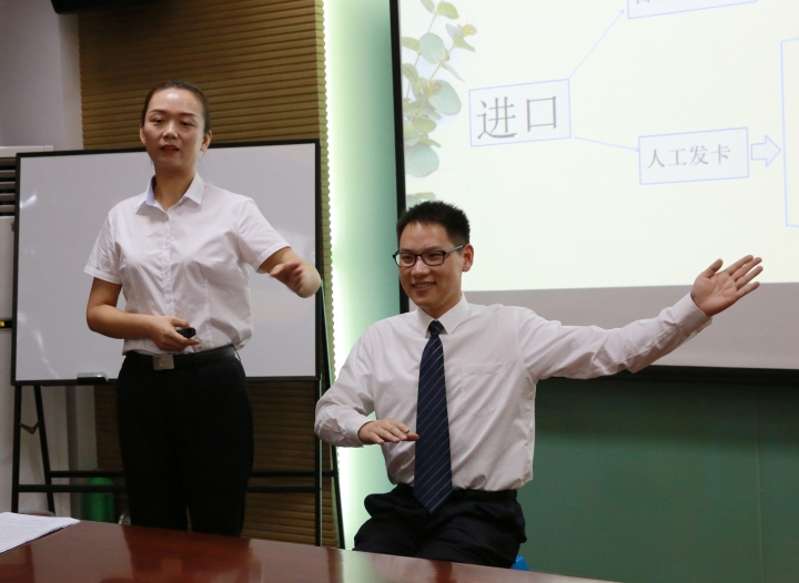 隨后,臨海南收費所文明服務培訓師徐蘇蘇通過PPT,以輕松風趣的講課風格,給班子領導們上了一堂儀容儀表講解、操作流程演示、文明服務動作以及心理建設的課,并通過員工真人示范文明服務中坐姿、眼神、聲音等練習,令在場的受訓者耳目一新。