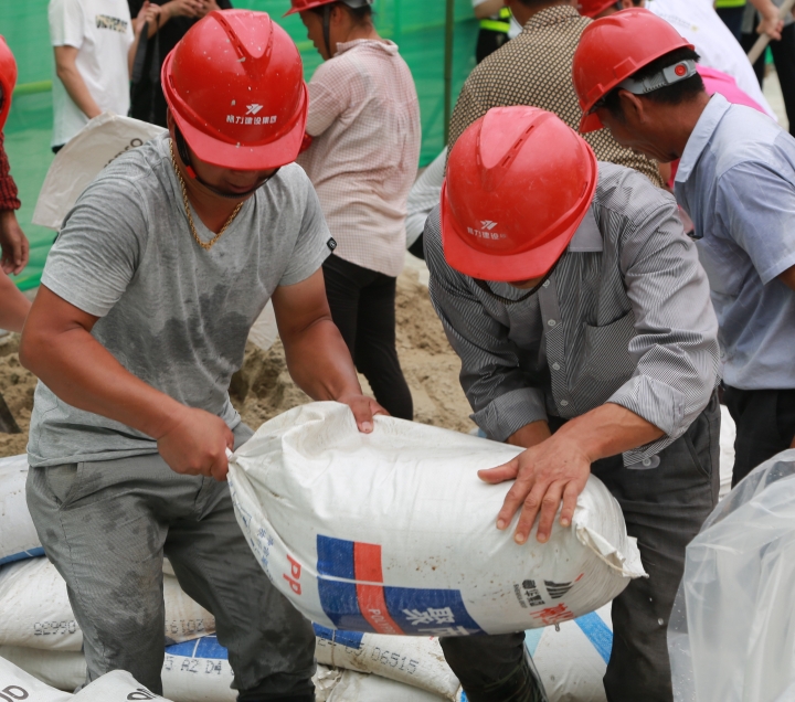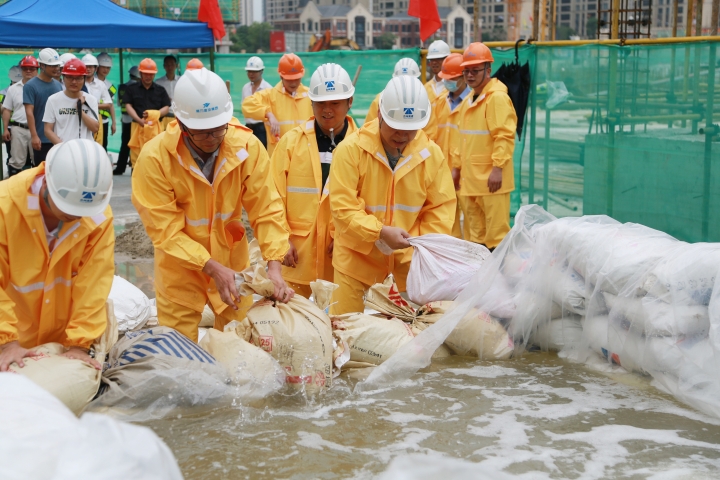 圖為模擬建筑工地面對(duì)洪水倒灌的現(xiàn)場(chǎng)應(yīng)急搶險(xiǎn)