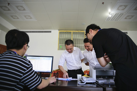 圖為集團(tuán)副董事長(zhǎng)、總經(jīng)理張建平在臨海股權(quán)收購(gòu)點(diǎn)檢查工作人員業(yè)務(wù)操作