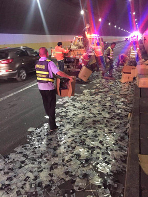 兩起事故的接連發生使救援工作緊張。2分鐘后,執勤隊火速趕到了事故現場,為了以最短時間恢復正常通行,隊長謝永濱決定兵分兩組,一組自己帶隊對第二起事故立即進行處理,讓輕微擦傷的三輛事故車先撤離現場,在下個出口等待交警處置,并向監控中心通知需拖車前來施救,與此同時加強預警,快速疏導交通。另一組由執勤隊員跑步前進查看事故現場,了解車輛情況。經查看,該貨車因爆胎導致撞車,所幸側翻事故未造成人員傷亡。在各部門的通力配合下,一個小時后,事故現場清理完畢,隧道恢復了正常通行。