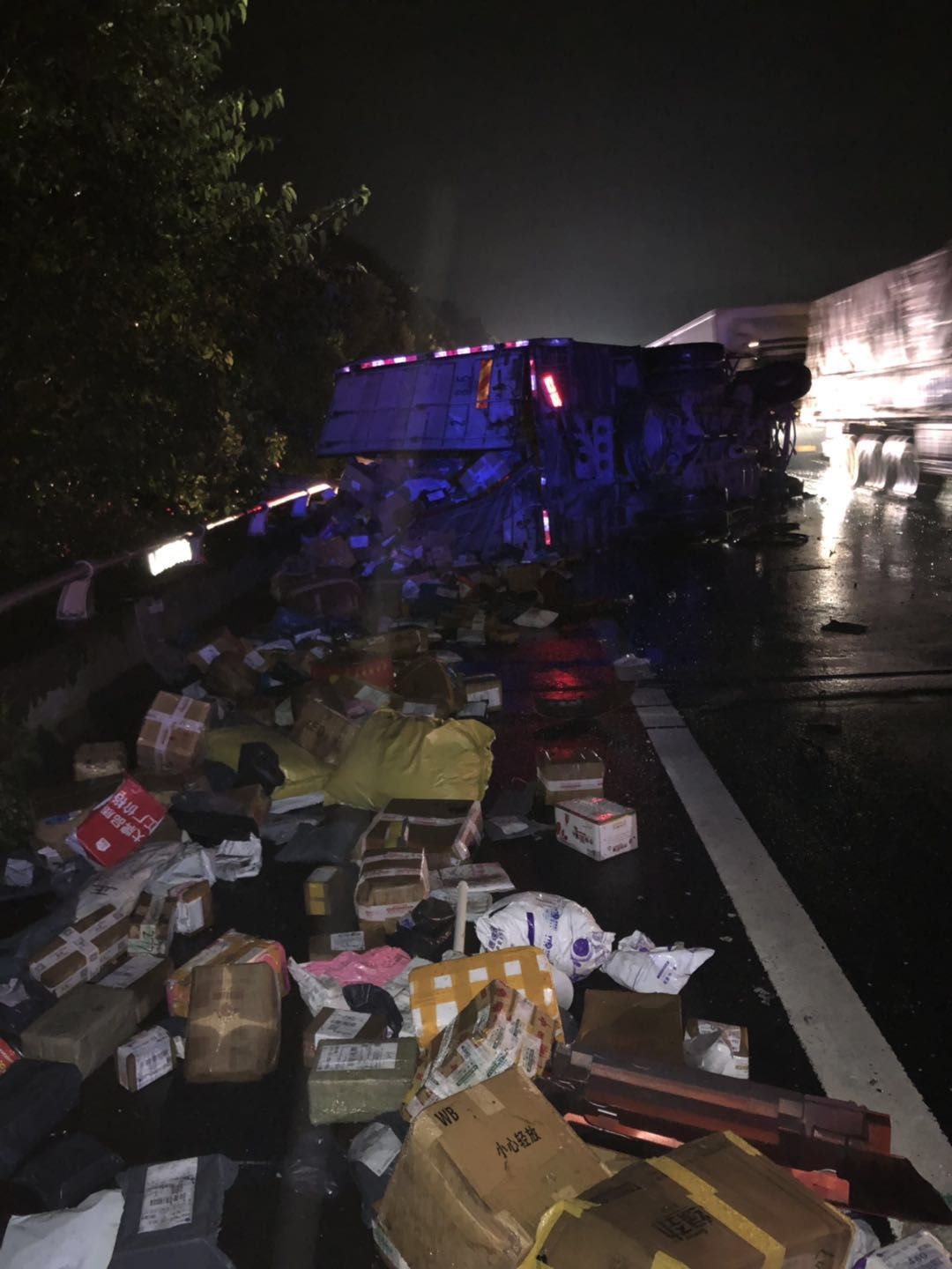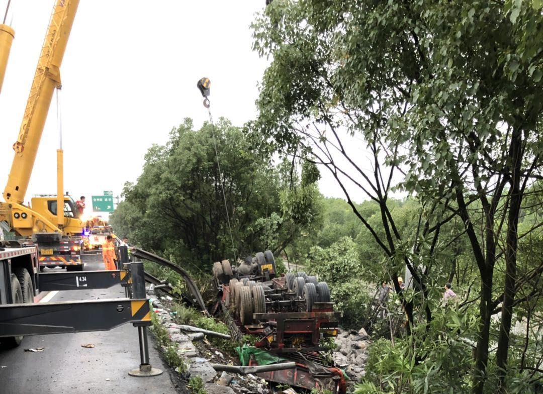 7月14日凌晨1點(diǎn),溫州方向臺(tái)州南收費(fèi)所附近,一輛半掛型大貨車和一輛快遞車相撞,半掛車直接沖出高速,四腳朝天。快遞車則是被巨大的沖擊力撞向了硬路肩,側(cè)翻中撒下數(shù)十米的貨物。1點(diǎn)10分,救援車輛到達(dá)現(xiàn)場,現(xiàn)場一片狼藉,防撞護(hù)欄板、護(hù)欄柱損傷嚴(yán)重,橋梁鋼管都折斷了不少。