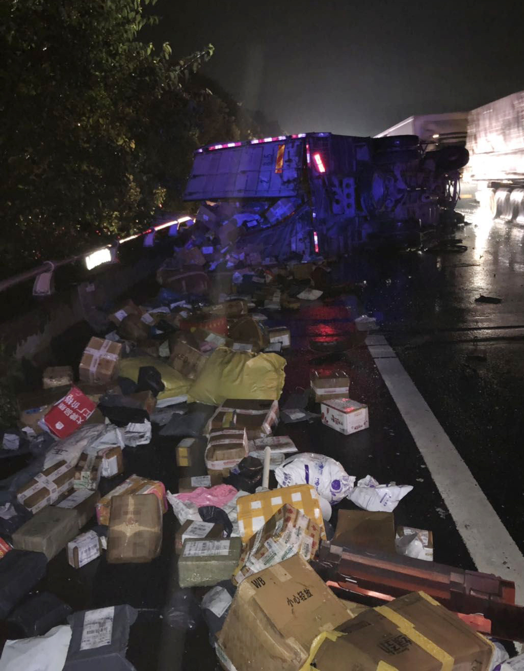 圖為事故車上灑落一地的快遞