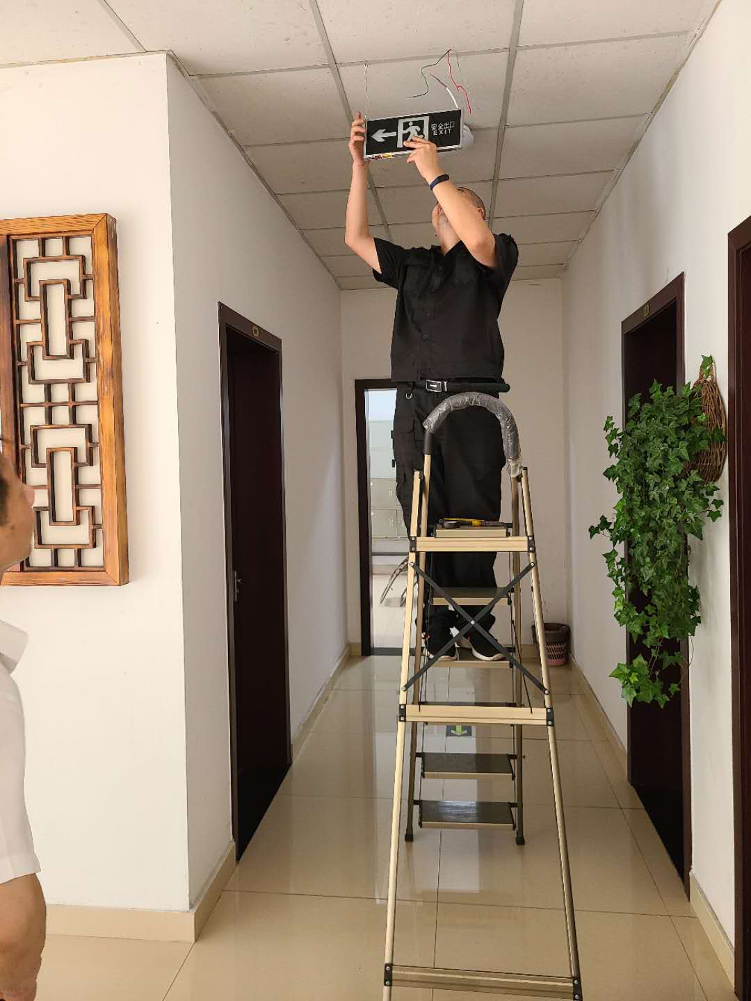 圖為技術(shù)人員安裝現(xiàn)場 在得知這一情況后,維養(yǎng)中心積極協(xié)助收費站所購買相關(guān)的主材及配件,并主動承擔了這些設(shè)備安裝工作。由于設(shè)備安裝位置很多沒有直接可用電源,中心技術(shù)員們就從四五米外甚至更遠的地方,一路套管放線過來取電,并用電錘等工具為其開孔固定,最后再完成接線送電。經(jīng)過2天努力,這些帶有方向提示標識、安全出口標識的燈牌被安裝在各層樓梯出口、拐角或主要通道上,因全部帶有儲電功能,即便在斷電的情況下也能發(fā)光發(fā)亮。