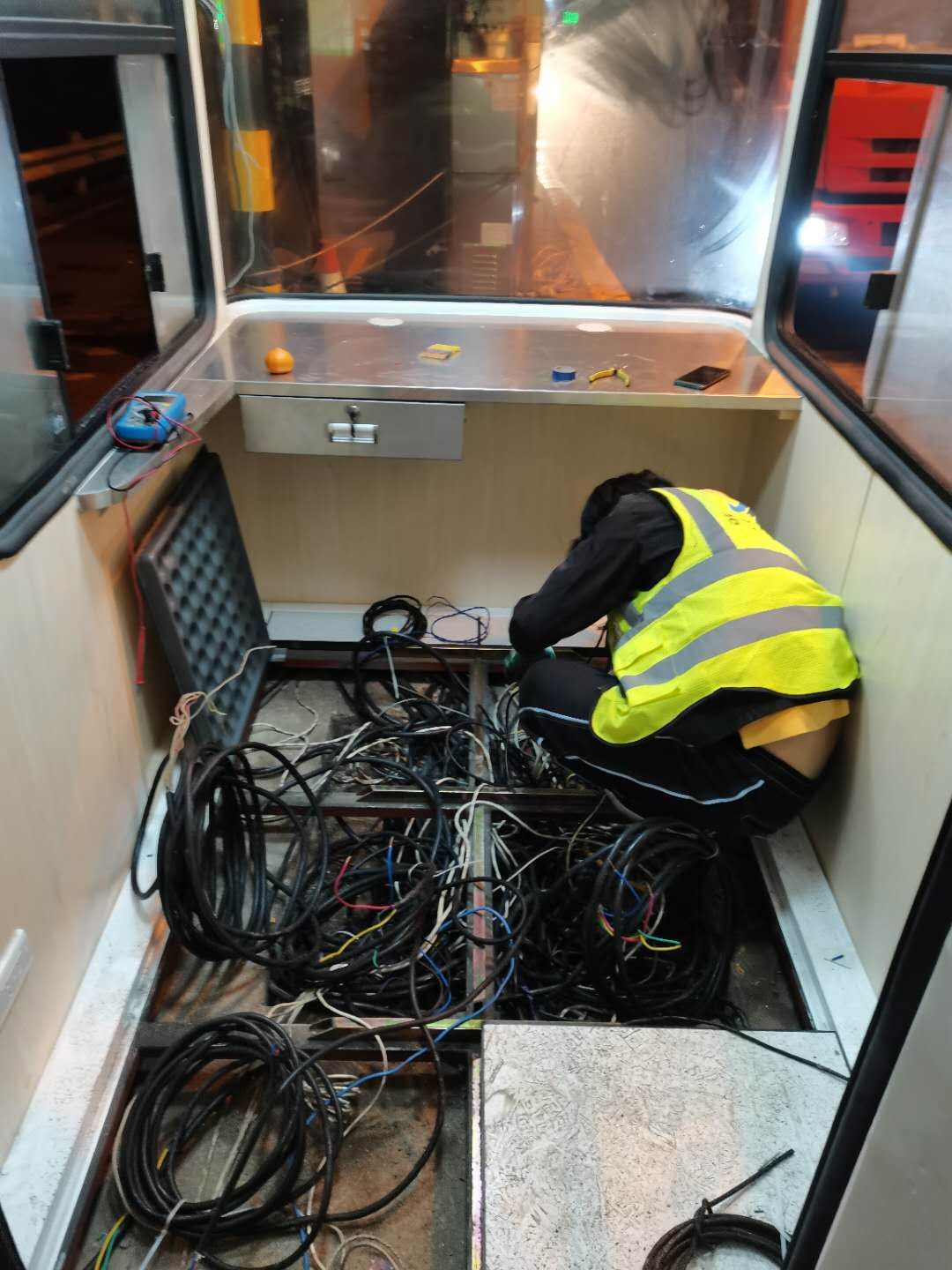 21日下午4點左右,訂購的新崗?fù)ず蛽p壞的設(shè)備設(shè)施陸續(xù)到位,中心值班人員協(xié)同設(shè)備廠家一起將其安放并固定至車道原位置。因崗?fù)A倒時拉斷了底下很多線纜,在拆除設(shè)備時又因為緊急搶修需要沒有作相應(yīng)標(biāo)注,現(xiàn)場各種電線接頭雜亂如麻??紤]到夜間查線、接線存在一定的安全隱患,也不利于施工,搶修人員決定第二天再戰(zhàn)。