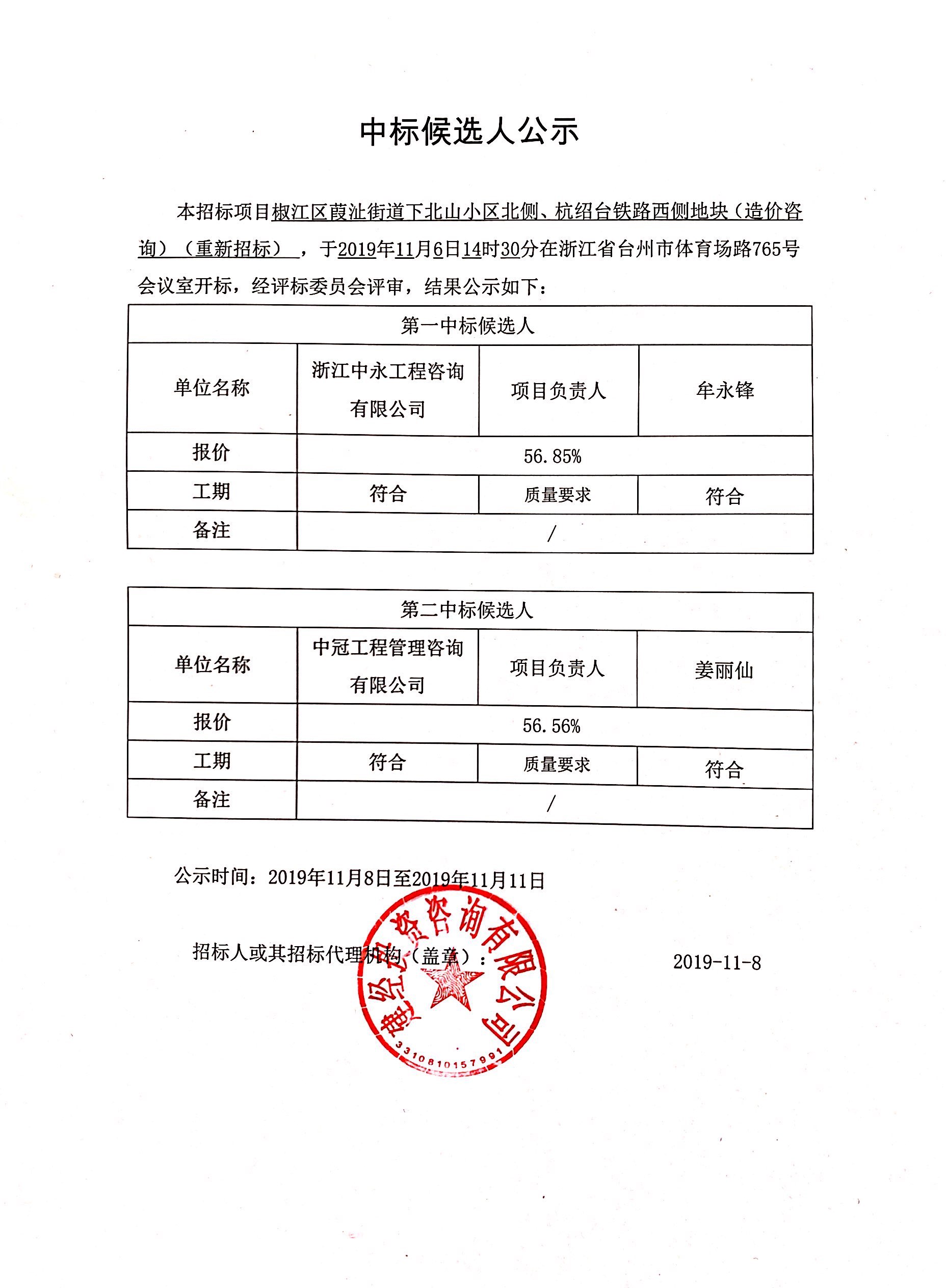 椒江區葭沚街道下北山小區北側、杭紹臺鐵路西側地塊(造價咨詢)中標候選人公示