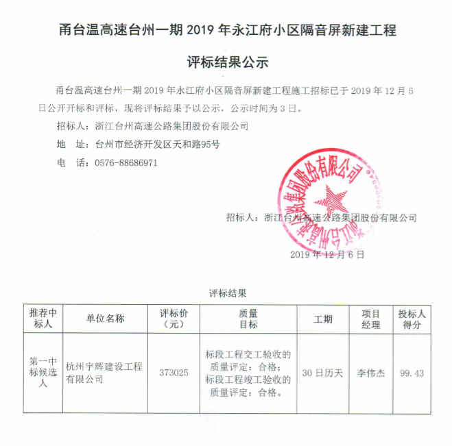 甬臺溫高速臺州一期2019年永江府小區隔音屏新建工程評標結果公示